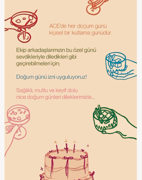 Every birthday is a personal celebration at ACE. We offer “Birthday Leave” so our team members can spend this special day with their loved ones however they wish.