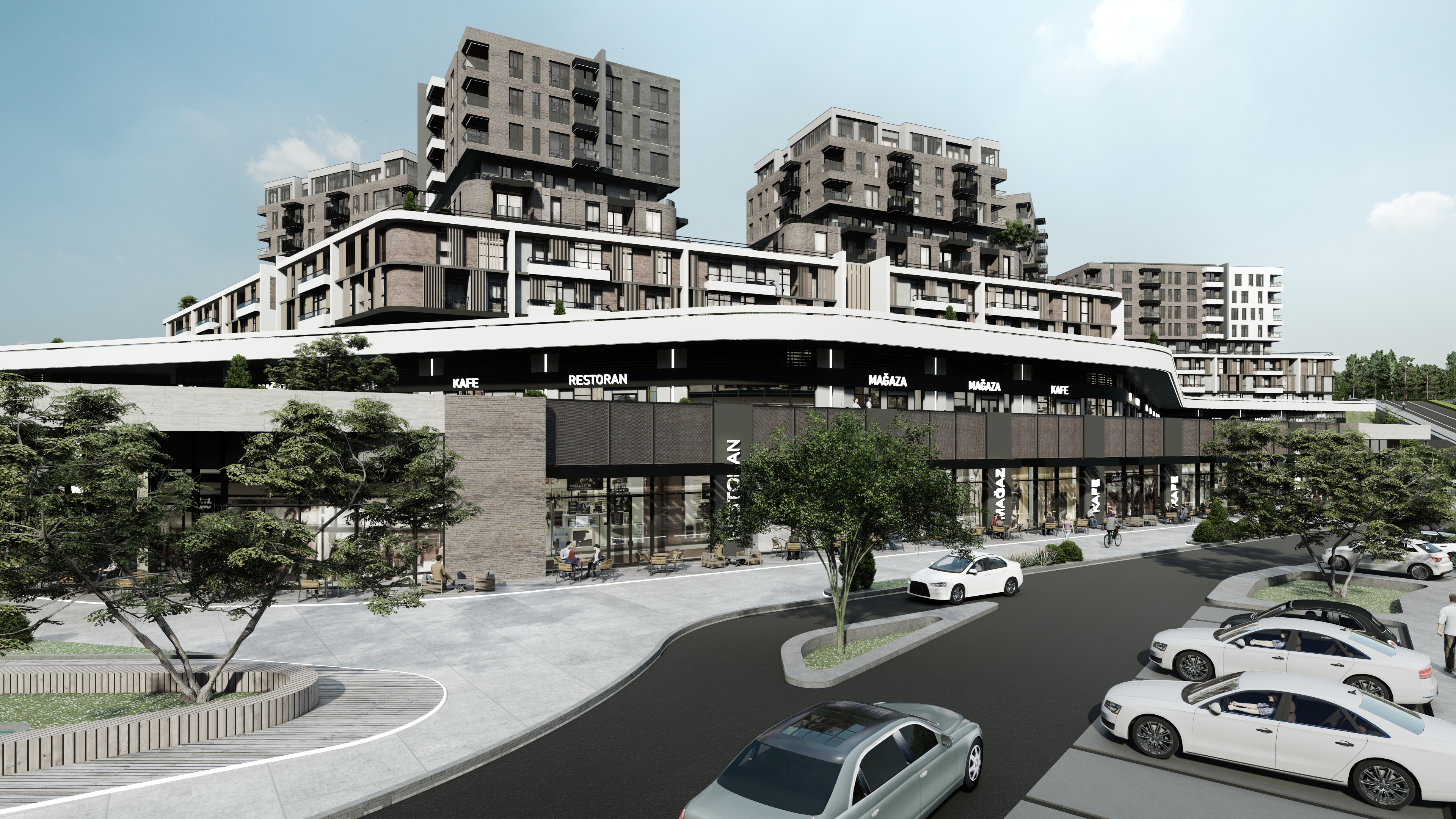 Proje, oldukça eğimli olan arazide, konut ve ticari fonksiyonlarının bir aradalığından oluşmaktadır.Tasarım için önemli bir girdi olan eğimden faydalanılarak, kamusal ve özel alanların farklı ihtiyaçları göz önünde bulundurULmuş ve her iki fonksiyon için de özel alanlar tanımlanmıştır.